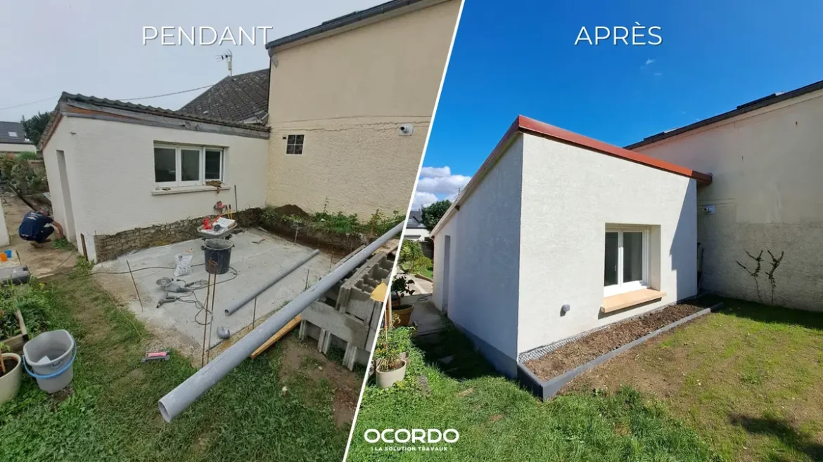 Extension et aménagement d’une dépendance à Amiens ! Par Ocordo 1 octobre 2024 1 octobre 2024 1,6K Date de réalisation 07/2024 Durée du chantier 3 mois Lieu Amiens Description du projet Ocordo Travaux Amiens est fier de vous présenter un beau projet d’extension et d’aménagement d’une dépendance existante à Amiens. Ce chantier, mené sous la supervision d’un maître d’œuvre, a transformé un espace de 15 m² en une zone fonctionnelle et accueillante.Un projet suivi de A à Z par un maître d’œuvre du réseauDès le début du projet, un maître d’œuvre appartenant à notre réseau d’artisans locaux a pris en charge le relevé de l’état actuel de la dépendance ainsi que l’élaboration des plans d’avant-projet. Ce suivi rigoureux a permis de garantir que chaque détail était pris en compte, et que l’extension répondait aux attentes et aux besoins des propriétaires.Le maître d’œuvre a ensuite rédigé un cahier des charges précis, définissant l’ensemble des travaux à réaliser. Il s’est également assuré que le projet se déroulait dans le respect du budget et des délais prévus.Création d’un espace pratique, accueillant et confortableL’extension a été conçue pour optimiser l’espace et offrir une fonctionnalité maximale.En s’ajoutant à la dépendance déjà existante, cette extension apporte une vraie plus-value à la maison.Le résultat ?Une pièce lumineuse comprenant une grande chambre, une kitchenette fonctionnelle, une salle de bain et des WC.Grâce à Ocordo Travaux Amiens et au travail professionnel des artisans du réseau Ocordo, cette dépendance est devenue un espace moderne et convivial, parfaitement adapté à ses nouvelles fonctions.Découvrez-en plus en consultant les photos !Mais surtout, le plus important, une pièce répondant totalement aux besoins des propriétaires qui sont ravis du résultat de ces travaux.En effet, les artisans intervenus sur ce projet de construction d’extension et d’aménagement d’une dépendance ont obtenu une note moyenne de 9,75/10 !Si vous avez des projets d’extension ou d’aménagement, n’hésitez pas à nous contacter pour bénéficier de l’expertise de notre réseau d’artisans et de maîtres d’œuvre qualifiés.Nous serons ravis de vous accompagner dans la réalisation de vos projets ! Découvrir l'agence d'Amiens Autres réalisations Rénovation d’une maison à Amiens Rénovation d’un appartement à Nantes Rénovation extérieure d’une maison à Châtelaillon-Plage Rénovation intérieur d’une maison à Longeneau Rénovation d’un appartement à Amiens Rénovation d’un vieil appartement à Reims Transformation intérieure à Reims Transformation intérieure à Reims Rénovation d’un studio à Reims Rénovation d’une maison à Rilly-la-Montagne